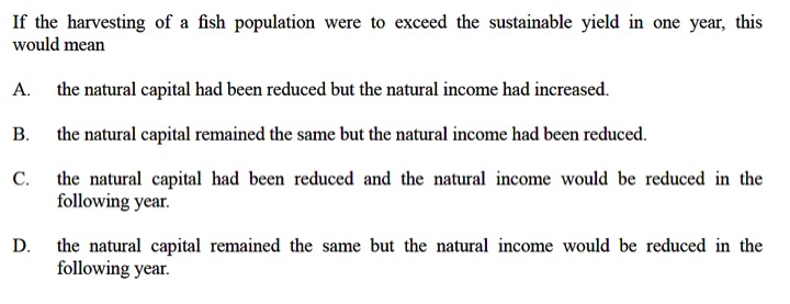 natural income = the ‘flow’ material or services that can be harvested e.g. timber and recreation