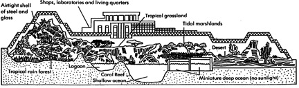 Work has begun on a fabulous space city in preparation for the day people colonize the planets. When the £20 million complex is finished in 1989, eight people will be locked inside this unique environment. The three-acre wonder in Arizona is really an Earth in miniature. It will contain tiny oceans, rain forests, marshlands and deserts all contained within the airtight shield of glass and steel.